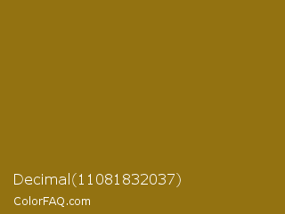 Decimal 11081832037 Color is a normal orange color and the nearest color is Sand Dune #967117. Hex code #937211 and RGB value is rgb(147,114,17). In RGB color space, this color is composed of 58% red, 45% green, 7% blue, In CMYK color space, this color is composed of 0% cyan, 22% magenta, 88% yellow , 42% black , In HSL color space, this color has a hue angle of 45° , 79% saturation and 32% lightness.