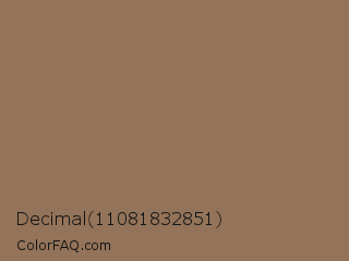 Decimal 11081832851 Color is a normal orange color and the nearest color is Leather #967059. Hex code #937359 and RGB value is rgb(147,115,89). In RGB color space, this color is composed of 58% red, 45% green, 35% blue, In CMYK color space, this color is composed of 0% cyan, 22% magenta, 39% yellow , 42% black , In HSL color space, this color has a hue angle of 27° , 25% saturation and 46% lightness.
