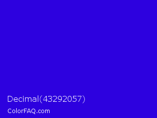 Decimal 43292057 Color is a normal indigo color and the nearest color is Interdimensional Blue #360ccc. Hex code #2d01df and RGB value is rgb(45,1,223). In RGB color space, this color is composed of 18% red, 0% green, 87% blue, In CMYK color space, this color is composed of 80% cyan, 100% magenta, 0% yellow , 13% black , In HSL color space, this color has a hue angle of 252° , 99% saturation and 44% lightness.