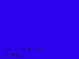 Decimal 43292777 Color is a normal indigo color and the nearest color is Electric Ultramarine #3f00ff. Hex code #2d02ed and RGB value is rgb(45,2,237). In RGB color space, this color is composed of 18% red, 1% green, 93% blue, In CMYK color space, this color is composed of 81% cyan, 99% magenta, 0% yellow , 7% black , In HSL color space, this color has a hue angle of 251° , 98% saturation and 47% lightness.