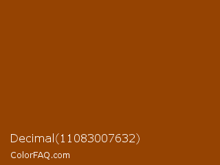Decimal 11083007632 Color is a dark orange color and the nearest color is Oregon #9b4703. Hex code #954302 and RGB value is rgb(149,67,2). In RGB color space, this color is composed of 58% red, 26% green, 1% blue, In CMYK color space, this color is composed of 0% cyan, 55% magenta, 99% yellow , 42% black , In HSL color space, this color has a hue angle of 27° , 97% saturation and 30% lightness.