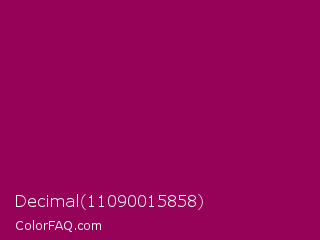 Decimal 11090015858 Color is a dark magenta color and the nearest color is Cardinal Pink #8c055e. Hex code #960258 and RGB value is rgb(150,2,88). In RGB color space, this color is composed of 59% red, 1% green, 35% blue, In CMYK color space, this color is composed of 0% cyan, 99% magenta, 41% yellow , 41% black , In HSL color space, this color has a hue angle of 325° , 97% saturation and 30% lightness.