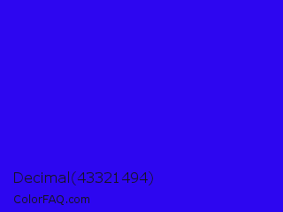 Decimal 43321494 Color is a normal indigo color and the nearest color is Electric Ultramarine #3f00ff. Hex code #2d06f0 and RGB value is rgb(45,6,240). In RGB color space, this color is composed of 18% red, 2% green, 94% blue, In CMYK color space, this color is composed of 81% cyan, 98% magenta, 0% yellow , 6% black , In HSL color space, this color has a hue angle of 250° , 95% saturation and 48% lightness.
