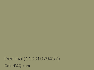 Decimal 11091079457 Color is a normal yellow color and the nearest color is Gurkha #9a9577. Hex code #979671 and RGB value is rgb(151,150,113). In RGB color space, this color is composed of 59% red, 59% green, 44% blue, In CMYK color space, this color is composed of 0% cyan, 1% magenta, 25% yellow , 41% black , In HSL color space, this color has a hue angle of 58° , 15% saturation and 52% lightness.