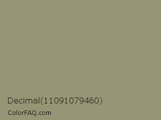 Decimal 11091079460 Color is a normal yellow color and the nearest color is Gurkha #9a9577. Hex code #979674 and RGB value is rgb(151,150,116). In RGB color space, this color is composed of 59% red, 59% green, 45% blue, In CMYK color space, this color is composed of 0% cyan, 1% magenta, 23% yellow , 41% black , In HSL color space, this color has a hue angle of 58° , 14% saturation and 52% lightness.
