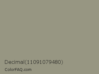 Decimal 11091079480 Color is a normal yellow color and the nearest color is Gurkha #9a9577. Hex code #979682 and RGB value is rgb(151,150,130). In RGB color space, this color is composed of 59% red, 59% green, 51% blue, In CMYK color space, this color is composed of 0% cyan, 1% magenta, 14% yellow , 41% black , In HSL color space, this color has a hue angle of 57° , 9% saturation and 55% lightness.