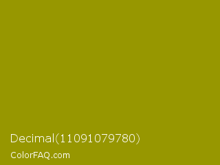 Decimal 11091079780 Color is a dark yellow color and the nearest color is Dark Yellow #9b870c. Hex code #979700 and RGB value is rgb(151,151,0). In RGB color space, this color is composed of 59% red, 59% green, 0% blue, In CMYK color space, this color is composed of 0% cyan, 0% magenta, 100% yellow , 41% black , In HSL color space, this color has a hue angle of 60° , 100% saturation and 30% lightness.