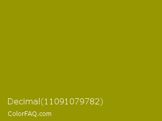 Decimal 11091079782 Color is a dark yellow color and the nearest color is Dark Yellow #9b870c. Hex code #979702 and RGB value is rgb(151,151,2). In RGB color space, this color is composed of 59% red, 59% green, 1% blue, In CMYK color space, this color is composed of 0% cyan, 0% magenta, 99% yellow , 41% black , In HSL color space, this color has a hue angle of 60° , 97% saturation and 30% lightness.
