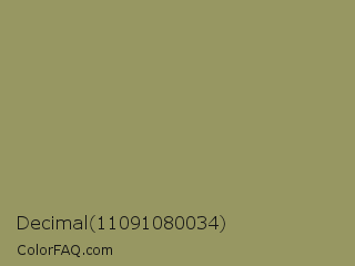 Decimal 11091080034 Color is a normal yellow color and the nearest color is Moss Green #8a9a5b. Hex code #979762 and RGB value is rgb(151,151,98). In RGB color space, this color is composed of 59% red, 59% green, 38% blue, In CMYK color space, this color is composed of 0% cyan, 0% magenta, 35% yellow , 41% black , In HSL color space, this color has a hue angle of 60° , 21% saturation and 49% lightness.