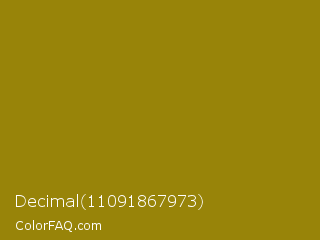 Decimal 11091867973 Color is a normal yellow color and the nearest color is Dark Yellow #9b870c. Hex code #988409 and RGB value is rgb(152,132,9). In RGB color space, this color is composed of 60% red, 52% green, 4% blue, In CMYK color space, this color is composed of 0% cyan, 13% magenta, 94% yellow , 40% black , In HSL color space, this color has a hue angle of 52° , 89% saturation and 32% lightness.