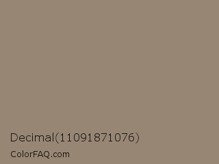 Decimal 11091871076 Color is a normal orange color and the nearest color is Arrowtown #948771. Hex code #988674 and RGB value is rgb(152,134,116). In RGB color space, this color is composed of 60% red, 53% green, 45% blue, In CMYK color space, this color is composed of 0% cyan, 12% magenta, 24% yellow , 40% black , In HSL color space, this color has a hue angle of 30° , 15% saturation and 53% lightness.