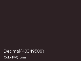 Decimal 43349508 Color is a very dark red color and the nearest color is Cocoa Brown #301f1e. Hex code #2d2124 and RGB value is rgb(45,33,36). In RGB color space, this color is composed of 18% red, 13% green, 14% blue, In CMYK color space, this color is composed of 0% cyan, 27% magenta, 20% yellow , 82% black , In HSL color space, this color has a hue angle of 345° , 15% saturation and 15% lightness.