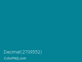 Decimal 2709552 Color is a dark cyan color and the nearest color is Blue Chill #0c8990. Hex code #048396 and RGB value is rgb(4,131,150). In RGB color space, this color is composed of 2% red, 51% green, 59% blue, In CMYK color space, this color is composed of 97% cyan, 13% magenta, 0% yellow , 41% black , In HSL color space, this color has a hue angle of 188° , 95% saturation and 30% lightness.