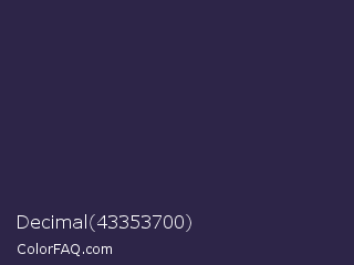 Decimal 43353700 Color is a very dark indigo color and the nearest color is Port Gore #251f4f. Hex code #2d2548 and RGB value is rgb(45,37,72). In RGB color space, this color is composed of 18% red, 15% green, 28% blue, In CMYK color space, this color is composed of 38% cyan, 49% magenta, 0% yellow , 72% black , In HSL color space, this color has a hue angle of 254° , 32% saturation and 21% lightness.