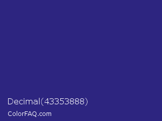 Decimal 43353888 Color is a normal indigo color and the nearest color is Cosmic Cobalt #2e2d88. Hex code #2d2580 and RGB value is rgb(45,37,128). In RGB color space, this color is composed of 18% red, 15% green, 50% blue, In CMYK color space, this color is composed of 65% cyan, 71% magenta, 0% yellow , 50% black , In HSL color space, this color has a hue angle of 245° , 55% saturation and 32% lightness.