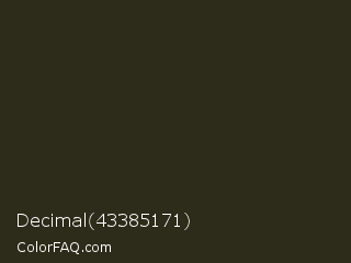 Decimal 43385171 Color is a very dark yellow color and the nearest color is Zeus #292319. Hex code #2d2b19 and RGB value is rgb(45,43,25). In RGB color space, this color is composed of 18% red, 17% green, 10% blue, In CMYK color space, this color is composed of 0% cyan, 4% magenta, 44% yellow , 82% black , In HSL color space, this color has a hue angle of 54° , 29% saturation and 14% lightness.