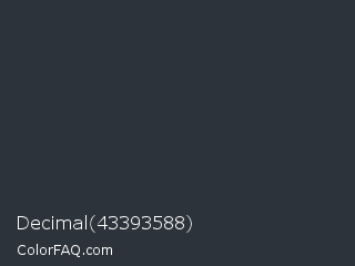 Decimal 43393588 Color is a very dark blue color and the nearest color is Gunmetal #2a3439. Hex code #2d333a and RGB value is rgb(45,51,58). In RGB color space, this color is composed of 18% red, 20% green, 23% blue, In CMYK color space, this color is composed of 22% cyan, 12% magenta, 0% yellow , 77% black , In HSL color space, this color has a hue angle of 212° , 13% saturation and 20% lightness.