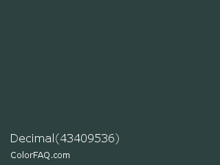 Decimal 43409536 Color is a very dark cyan color and the nearest color is Japanese Indigo #264348. Hex code #2d4240 and RGB value is rgb(45,66,64). In RGB color space, this color is composed of 18% red, 26% green, 25% blue, In CMYK color space, this color is composed of 32% cyan, 0% magenta, 3% yellow , 74% black , In HSL color space, this color has a hue angle of 174° , 19% saturation and 22% lightness.