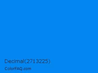 Decimal 2713225 Color is a normal blue color and the nearest color is Azure Radiance #007fff. Hex code #0486f1 and RGB value is rgb(4,134,241). In RGB color space, this color is composed of 2% red, 53% green, 95% blue, In CMYK color space, this color is composed of 98% cyan, 44% magenta, 0% yellow , 5% black , In HSL color space, this color has a hue angle of 207° , 97% saturation and 48% lightness.