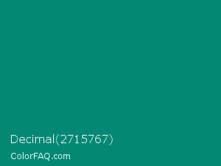 Decimal 2715767 Color is a dark cyan color and the nearest color is Observatory #02866f. Hex code #048875 and RGB value is rgb(4,136,117). In RGB color space, this color is composed of 2% red, 53% green, 46% blue, In CMYK color space, this color is composed of 97% cyan, 0% magenta, 14% yellow , 47% black , In HSL color space, this color has a hue angle of 171° , 94% saturation and 27% lightness.