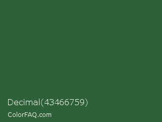 Decimal 43466759 Color is a dark green color and the nearest color is Mughal Green #306030. Hex code #2d6137 and RGB value is rgb(45,97,55). In RGB color space, this color is composed of 18% red, 38% green, 22% blue, In CMYK color space, this color is composed of 54% cyan, 0% magenta, 43% yellow , 62% black , In HSL color space, this color has a hue angle of 132° , 37% saturation and 28% lightness.