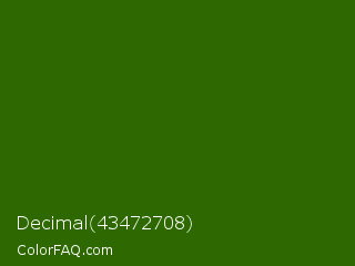 Decimal 43472708 Color is a very dark green color and the nearest color is Dell #396413. Hex code #2d6800 and RGB value is rgb(45,104,0). In RGB color space, this color is composed of 18% red, 41% green, 0% blue, In CMYK color space, this color is composed of 57% cyan, 0% magenta, 100% yellow , 59% black , In HSL color space, this color has a hue angle of 94° , 100% saturation and 20% lightness.