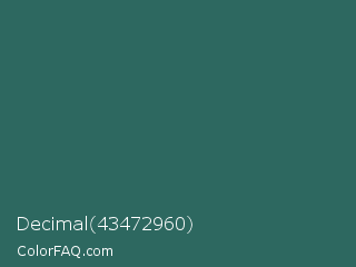 Decimal 43472960 Color is a dark cyan color and the nearest color is Casal #2f6168. Hex code #2d6860 and RGB value is rgb(45,104,96). In RGB color space, this color is composed of 18% red, 41% green, 38% blue, In CMYK color space, this color is composed of 57% cyan, 0% magenta, 8% yellow , 59% black , In HSL color space, this color has a hue angle of 172° , 40% saturation and 29% lightness.