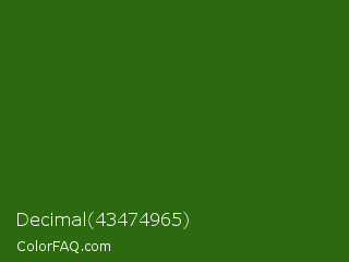 Decimal 43474965 Color is a dark green color and the nearest color is Dell #396413. Hex code #2d690f and RGB value is rgb(45,105,15). In RGB color space, this color is composed of 18% red, 41% green, 6% blue, In CMYK color space, this color is composed of 57% cyan, 0% magenta, 86% yellow , 59% black , In HSL color space, this color has a hue angle of 100° , 75% saturation and 24% lightness.