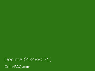 Decimal 43488071 Color is a dark green color and the nearest color is Bilbao #327c14. Hex code #2d7613 and RGB value is rgb(45,118,19). In RGB color space, this color is composed of 18% red, 46% green, 7% blue, In CMYK color space, this color is composed of 62% cyan, 0% magenta, 84% yellow , 54% black , In HSL color space, this color has a hue angle of 104° , 72% saturation and 27% lightness.
