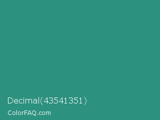 Decimal 43541351 Color is a normal cyan color and the nearest color is Lochinvar #2c8c84. Hex code #2d917f and RGB value is rgb(45,145,127). In RGB color space, this color is composed of 18% red, 57% green, 50% blue, In CMYK color space, this color is composed of 69% cyan, 0% magenta, 12% yellow , 43% black , In HSL color space, this color has a hue angle of 169° , 53% saturation and 37% lightness.