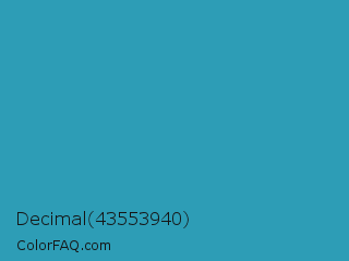 Decimal 43553940 Color is a normal cyan color and the nearest color is Eastern Blue #1e9ab0. Hex code #2d9db6 and RGB value is rgb(45,157,182). In RGB color space, this color is composed of 18% red, 62% green, 71% blue, In CMYK color space, this color is composed of 75% cyan, 14% magenta, 0% yellow , 29% black , In HSL color space, this color has a hue angle of 191° , 60% saturation and 45% lightness.