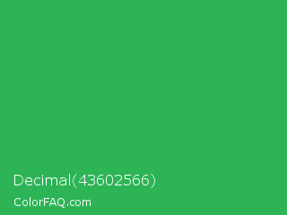 Decimal 43602566 Color is a normal green color and the nearest color is Chateau Green #40a860. Hex code #2db456 and RGB value is rgb(45,180,86). In RGB color space, this color is composed of 18% red, 71% green, 34% blue, In CMYK color space, this color is composed of 75% cyan, 0% magenta, 52% yellow , 29% black , In HSL color space, this color has a hue angle of 138° , 60% saturation and 44% lightness.