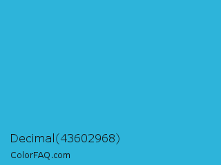 Decimal 43602968 Color is a normal cyan color and the nearest color is Scooter #2ebfd4. Hex code #2db4da and RGB value is rgb(45,180,218). In RGB color space, this color is composed of 18% red, 71% green, 85% blue, In CMYK color space, this color is composed of 79% cyan, 17% magenta, 0% yellow , 15% black , In HSL color space, this color has a hue angle of 193° , 70% saturation and 52% lightness.