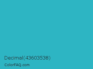 Decimal 43603538 Color is a normal cyan color and the nearest color is Maximum Blue Green #30bfbf. Hex code #2db5c4 and RGB value is rgb(45,181,196). In RGB color space, this color is composed of 18% red, 71% green, 77% blue, In CMYK color space, this color is composed of 77% cyan, 8% magenta, 0% yellow , 23% black , In HSL color space, this color has a hue angle of 186° , 63% saturation and 47% lightness.