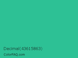 Decimal 43615863 Color is a normal green color and the nearest color is Mountain Meadow #30ba8f. Hex code #2dc195 and RGB value is rgb(45,193,149). In RGB color space, this color is composed of 18% red, 76% green, 58% blue, In CMYK color space, this color is composed of 77% cyan, 0% magenta, 23% yellow , 24% black , In HSL color space, this color has a hue angle of 162° , 62% saturation and 47% lightness.