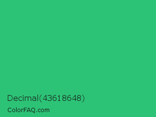 Decimal 43618648 Color is a normal green color and the nearest color is UFO Green #3cd070. Hex code #2dc376 and RGB value is rgb(45,195,118). In RGB color space, this color is composed of 18% red, 76% green, 46% blue, In CMYK color space, this color is composed of 77% cyan, 0% magenta, 39% yellow , 24% black , In HSL color space, this color has a hue angle of 149° , 63% saturation and 47% lightness.