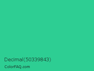 Decimal 50339843 Color is a normal green color and the nearest color is Shamrock #33cc99. Hex code #2dce93 and RGB value is rgb(45,206,147). In RGB color space, this color is composed of 18% red, 81% green, 58% blue, In CMYK color space, this color is composed of 78% cyan, 0% magenta, 29% yellow , 19% black , In HSL color space, this color has a hue angle of 158° , 64% saturation and 49% lightness.