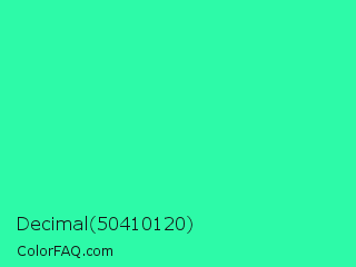 Decimal 50410120 Color is a normal green color and the nearest color is Eucalyptus #44d7a8. Hex code #2dfaa8 and RGB value is rgb(45,250,168). In RGB color space, this color is composed of 18% red, 98% green, 66% blue, In CMYK color space, this color is composed of 82% cyan, 0% magenta, 33% yellow , 2% black , In HSL color space, this color has a hue angle of 156° , 95% saturation and 58% lightness.