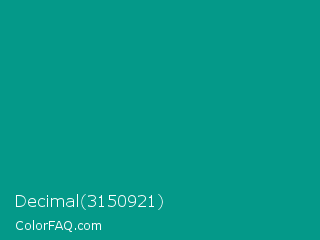 Decimal 3150921 Color is a normal cyan color and the nearest color is Niagara #06a189. Hex code #049989 and RGB value is rgb(4,153,137). In RGB color space, this color is composed of 2% red, 60% green, 54% blue, In CMYK color space, this color is composed of 97% cyan, 0% magenta, 10% yellow , 40% black , In HSL color space, this color has a hue angle of 174° , 95% saturation and 31% lightness.