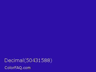Decimal 50431588 Color is a normal indigo color and the nearest color is Blue Gem #2c0e8c. Hex code #2e0fa8 and RGB value is rgb(46,15,168). In RGB color space, this color is composed of 18% red, 6% green, 66% blue, In CMYK color space, this color is composed of 73% cyan, 91% magenta, 0% yellow , 34% black , In HSL color space, this color has a hue angle of 252° , 84% saturation and 36% lightness.