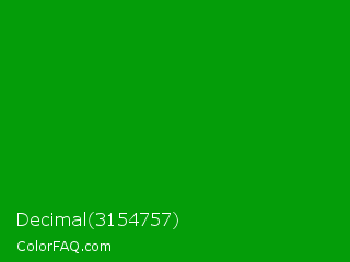 Decimal 3154757 Color is a normal green color and the nearest color is Islamic Green #009000. Hex code #049d09 and RGB value is rgb(4,157,9). In RGB color space, this color is composed of 2% red, 62% green, 4% blue, In CMYK color space, this color is composed of 97% cyan, 0% magenta, 94% yellow , 38% black , In HSL color space, this color has a hue angle of 122° , 95% saturation and 32% lightness.
