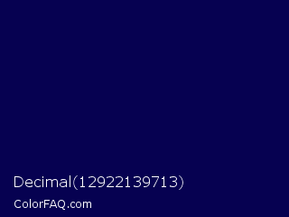 Decimal 12922139713 Color is a very dark indigo color and the nearest color is Stratos #000741. Hex code #060151 and RGB value is rgb(6,1,81). In RGB color space, this color is composed of 2% red, 0% green, 32% blue, In CMYK color space, this color is composed of 93% cyan, 99% magenta, 0% yellow , 68% black , In HSL color space, this color has a hue angle of 244° , 98% saturation and 16% lightness.