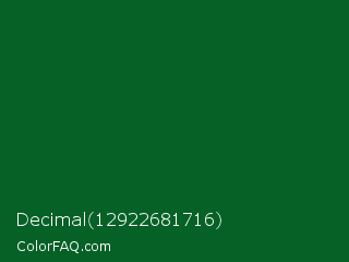 Decimal 12922681716 Color is a very dark green color and the nearest color is Camarone #00581a. Hex code #066126 and RGB value is rgb(6,97,38). In RGB color space, this color is composed of 2% red, 38% green, 15% blue, In CMYK color space, this color is composed of 94% cyan, 0% magenta, 61% yellow , 62% black , In HSL color space, this color has a hue angle of 141° , 88% saturation and 20% lightness.