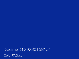 Decimal 12923015815 Color is a normal blue color and the nearest color is Imperial Blue #002395. Hex code #072997 and RGB value is rgb(7,41,151). In RGB color space, this color is composed of 3% red, 16% green, 59% blue, In CMYK color space, this color is composed of 95% cyan, 73% magenta, 0% yellow , 41% black , In HSL color space, this color has a hue angle of 226° , 91% saturation and 31% lightness.