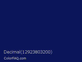 Decimal 12923803200 Color is a very dark blue color and the nearest color is Gulf Blue #051657. Hex code #081558 and RGB value is rgb(8,21,88). In RGB color space, this color is composed of 3% red, 8% green, 35% blue, In CMYK color space, this color is composed of 91% cyan, 76% magenta, 0% yellow , 65% black , In HSL color space, this color has a hue angle of 230° , 83% saturation and 19% lightness.