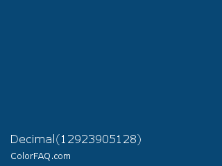 Decimal 12923905128 Color is a dark blue color and the nearest color is Dark Cerulean #08457e. Hex code #084774 and RGB value is rgb(8,71,116). In RGB color space, this color is composed of 3% red, 28% green, 45% blue, In CMYK color space, this color is composed of 93% cyan, 39% magenta, 0% yellow , 55% black , In HSL color space, this color has a hue angle of 205° , 87% saturation and 24% lightness.