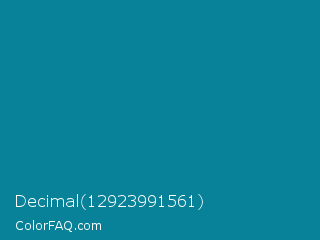 Decimal 12923991561 Color is a normal cyan color and the nearest color is Blue Chill #0c8990. Hex code #088299 and RGB value is rgb(8,130,153). In RGB color space, this color is composed of 3% red, 51% green, 60% blue, In CMYK color space, this color is composed of 95% cyan, 15% magenta, 0% yellow , 40% black , In HSL color space, this color has a hue angle of 190° , 90% saturation and 32% lightness.