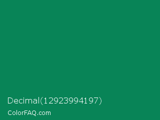 Decimal 12923994197 Color is a dark green color and the nearest color is Spanish Viridian #007f5c. Hex code #088457 and RGB value is rgb(8,132,87). In RGB color space, this color is composed of 3% red, 52% green, 34% blue, In CMYK color space, this color is composed of 94% cyan, 0% magenta, 34% yellow , 48% black , In HSL color space, this color has a hue angle of 158° , 89% saturation and 27% lightness.