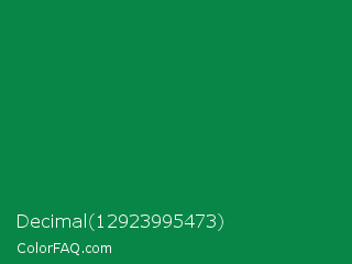 Decimal 12923995473 Color is a dark green color and the nearest color is Salem #097f4b. Hex code #088647 and RGB value is rgb(8,134,71). In RGB color space, this color is composed of 3% red, 53% green, 28% blue, In CMYK color space, this color is composed of 94% cyan, 0% magenta, 47% yellow , 47% black , In HSL color space, this color has a hue angle of 150° , 89% saturation and 28% lightness.