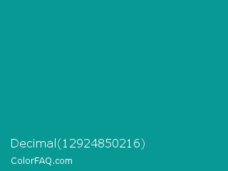 Decimal 12924850216 Color is a normal cyan color and the nearest color is Viridian Green #009698. Hex code #099994 and RGB value is rgb(9,153,148). In RGB color space, this color is composed of 4% red, 60% green, 58% blue, In CMYK color space, this color is composed of 94% cyan, 0% magenta, 3% yellow , 40% black , In HSL color space, this color has a hue angle of 178° , 89% saturation and 32% lightness.